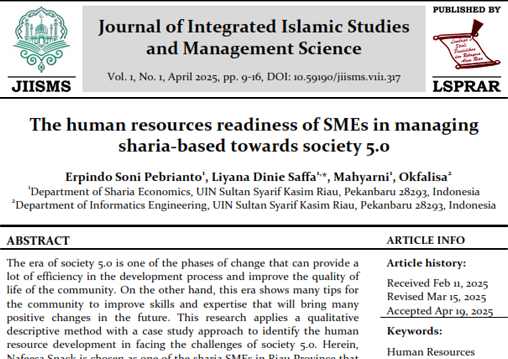Journal of Integrated Islamic Studies and Management Science (JIISMS) is a peer-reviewed journal (e-ISSN: - | p-ISSN: -) published regularly in April, August, and December by the Lembaga Studi Pendidikan and Rekayasa Alam Riau (LSPRAR) in collaborates with the Indonesian Physical Society (PSI)-Riau and Universitas Islam Mulia Yogyakarta. JIISMS is a periodical publication that publishes scientific articles on research results in the fields of basic science and engineering.